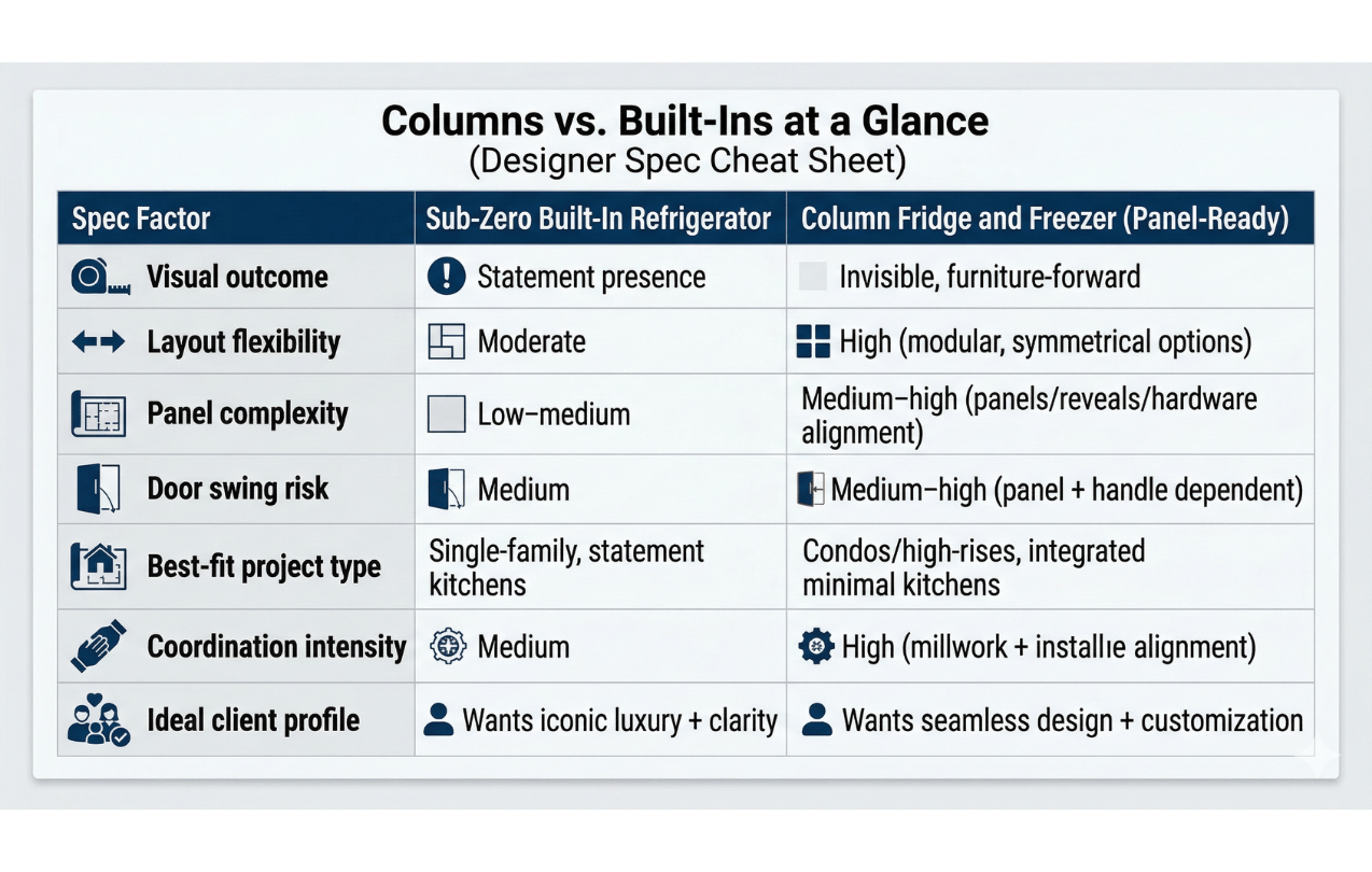 Use this as your quick decision tool—compare Sub-Zero built-ins and panel-ready columns across the spec factors that most often impact design intent, coordination, and install success in Miami projects.