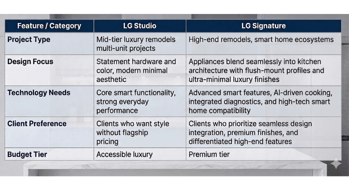 Choosing between LG Studio and LG Signature affects design, technology, and budget. Both lines deliver premium performance, but they serve different project types and client expectations.