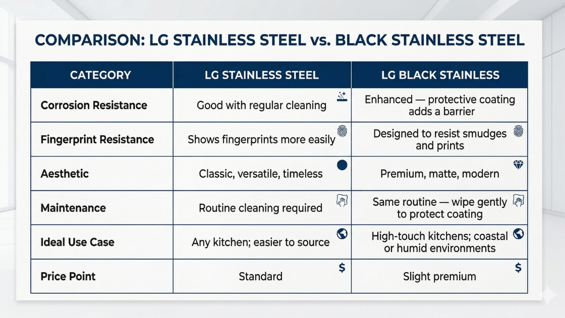 - LG black stainless features an additional protective coating that helps resist fingerprints, corrosion, and surface wear—making it a better match for high-humidity or coastal environments.