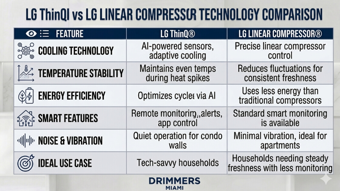 - Linear Compressor technology maintains consistent cold while cutting energy use, boosting efficiency and reliability in Miami’s heat and humidity.