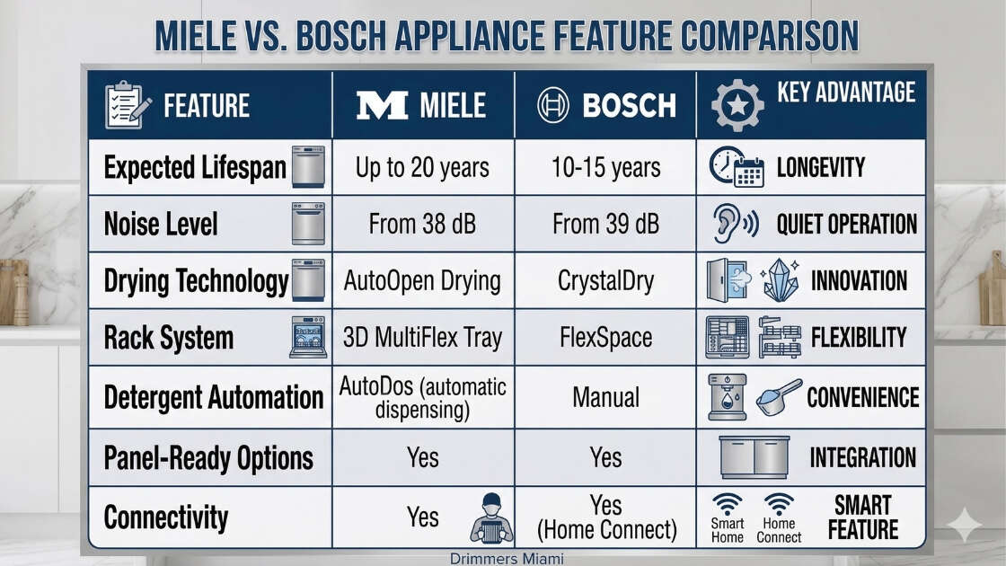 Lifespan is one of the most practical factors to weigh when investing in a luxury Miami kitchen. While both manufacturers have strong reputations for reliability, their engineering philosophies approach longevity in somewhat different ways.
