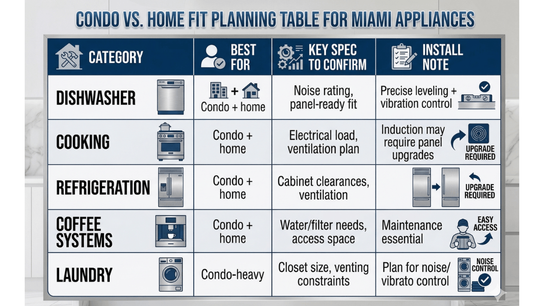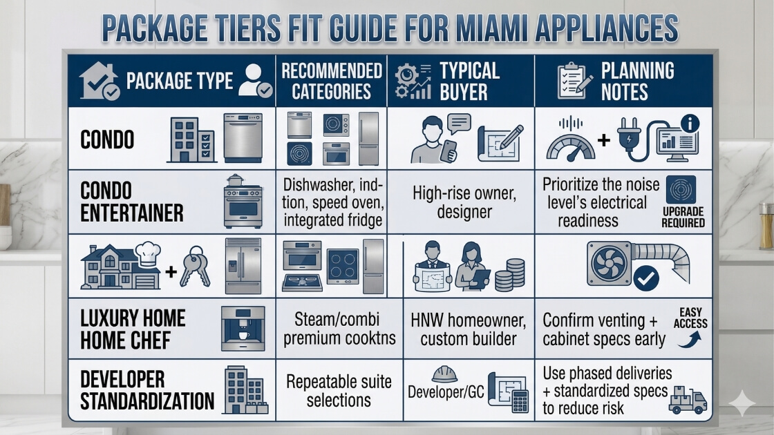 Miami projects come with real constraints: condo delivery rules, limited ventilation options, tight cabinet clearances, and electrical requirements that can shape your appliance choices. Use the sections below to compare categories, build a cohesive package, and confirm the specs that matter most—so you can move from shortlist to install plan with confidence.